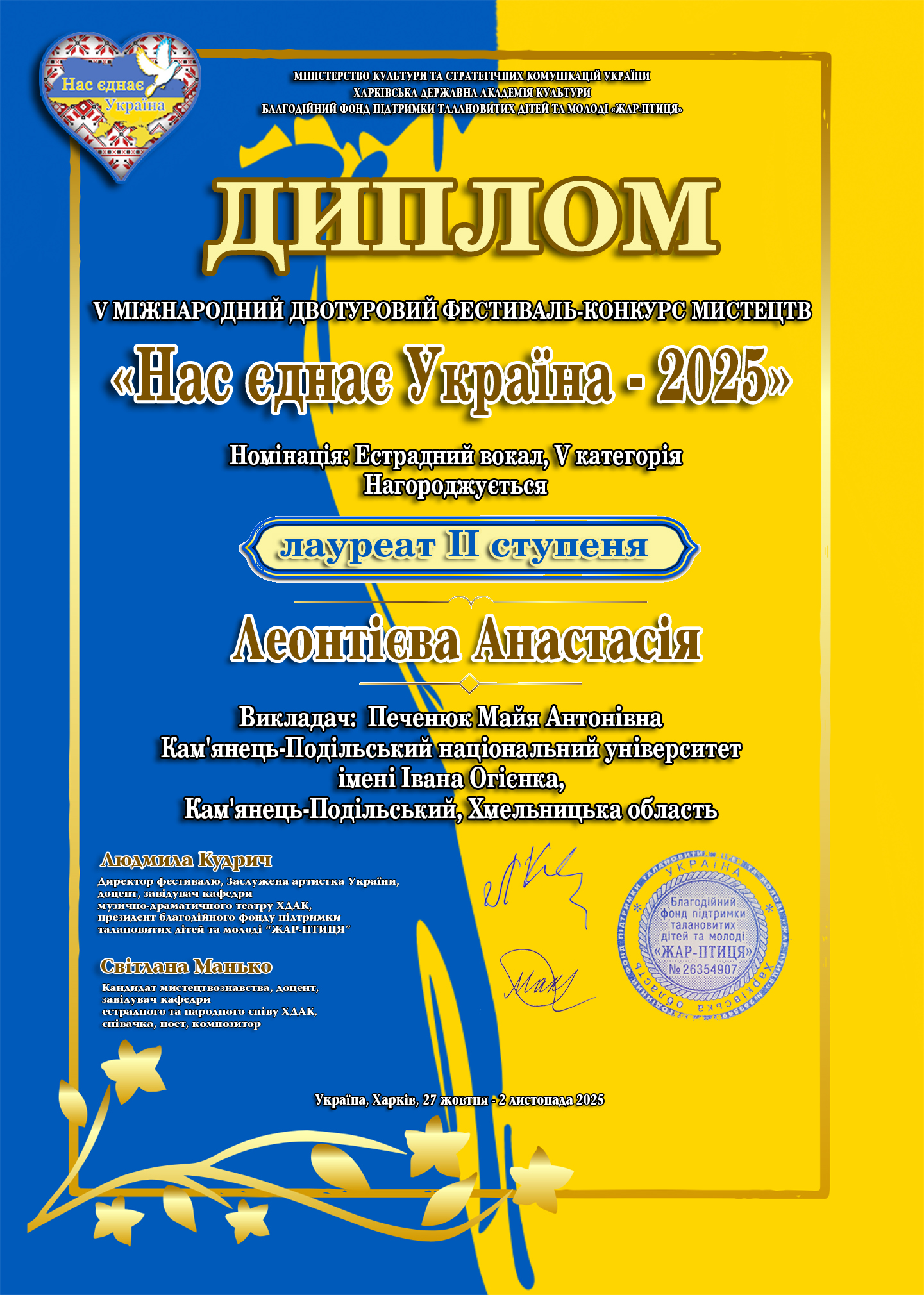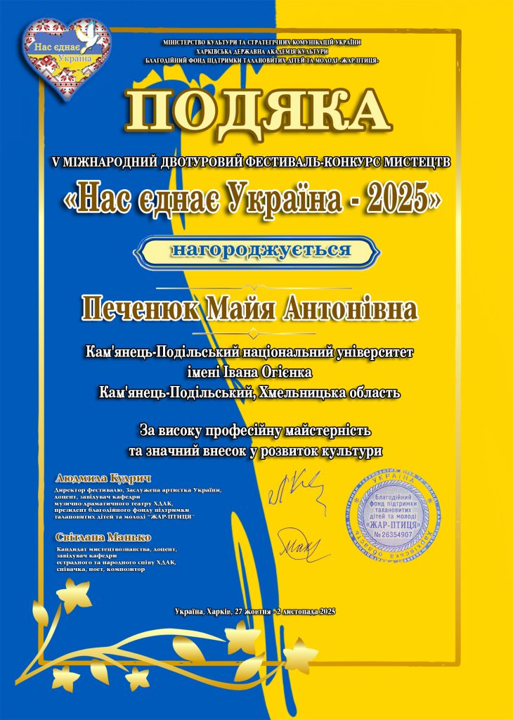 Студентка магістратури предметної спеціальності А4.13 Середня освіта (Мистецтво. Музичне мистецтво) Анастасія Леонтієва (клас професора М. Печенюк) стала лавреаткою ІІ ступеня V Міжнародного двотурового фестивалю-конкурсу мистецтв «Нас єднає Україна – 2025» (Харківська державна академія культури, номінація – «Естрадний вокал»).