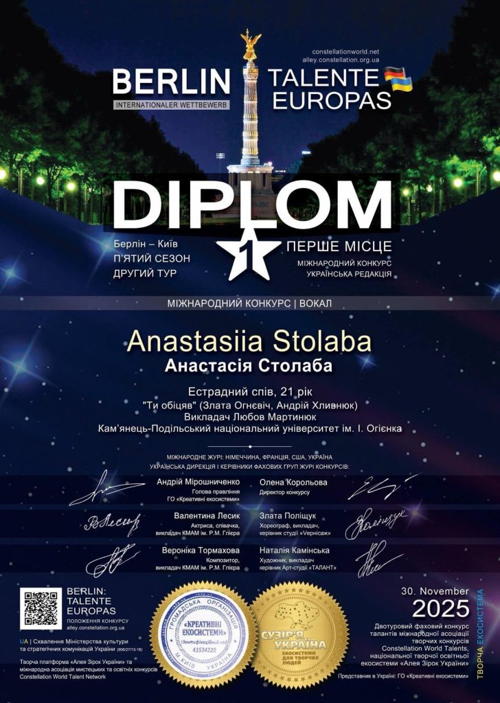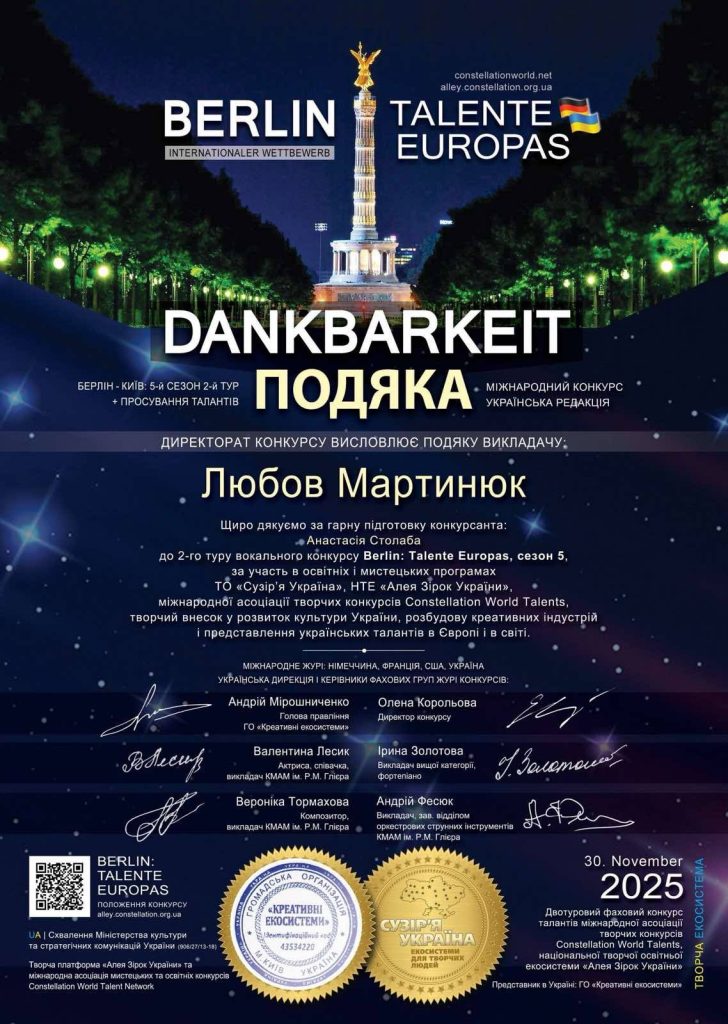 - V сезону Міжнародного конкурсу «Berlin. Talеnte Europas» – творчого змагання міжнародної асоціації мистецьких та освітніх конкурсів Constellation World Talents, Національної творчої освітньої екосистеми «Алея Зірок України» та міжнародної освітньої компанії AdverMAN Education;