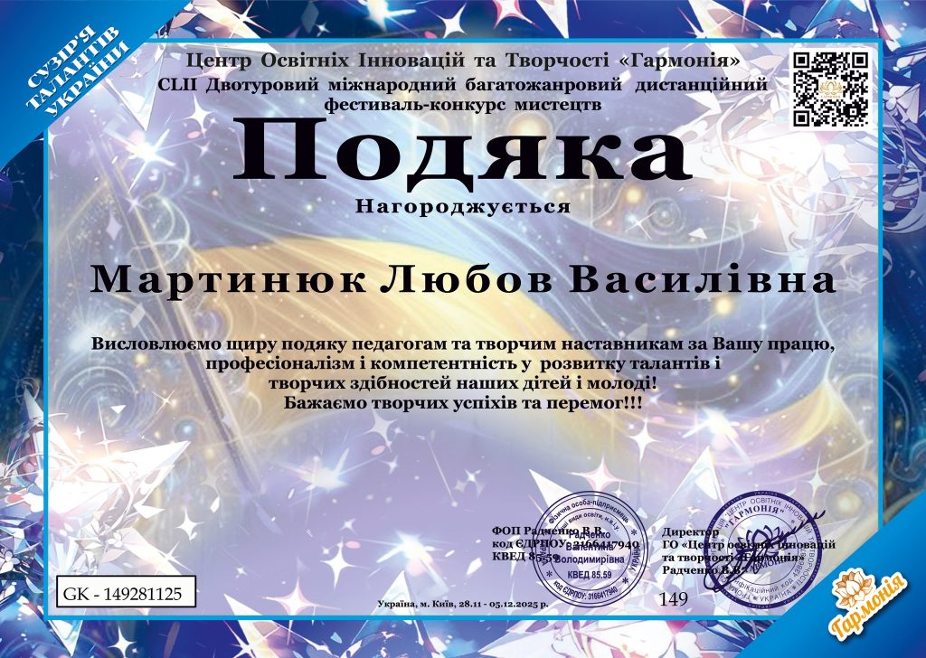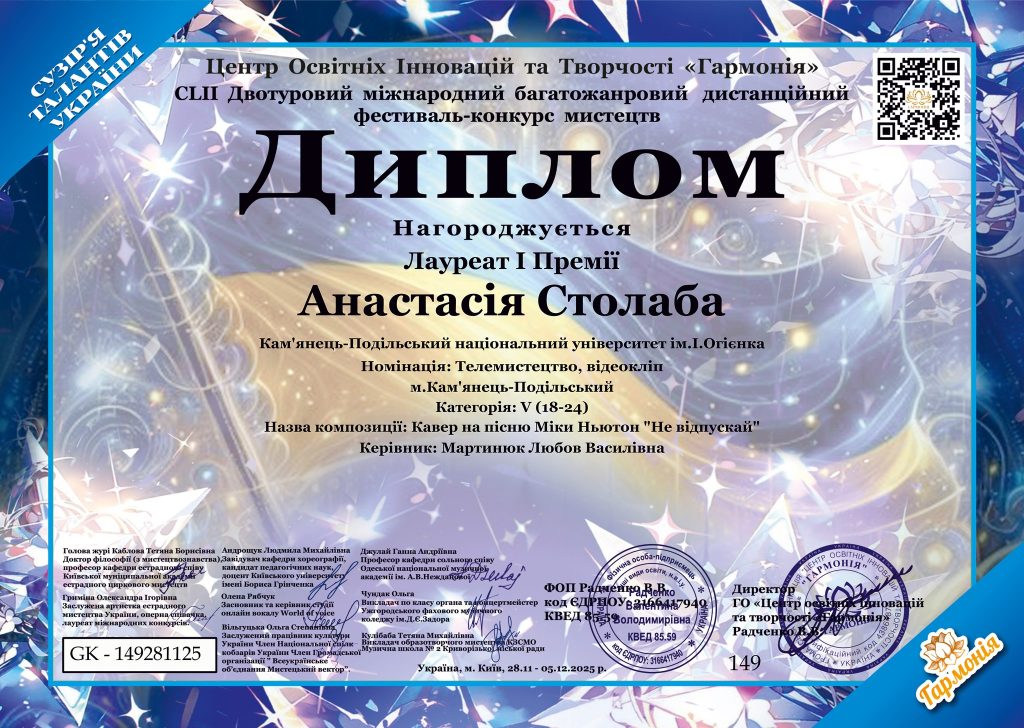 - Міжнародного двотурового багатожанрового дистанційного фестивалю-конкурсу мистецтв «Гармонія». Вітаємо талановиту студентку та її наставницю зі значними досягненнями та бажаємо нових здобутків та творчого натхнення.
