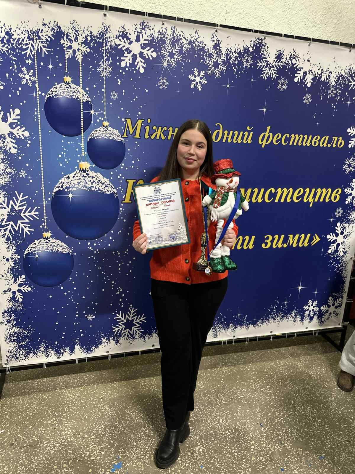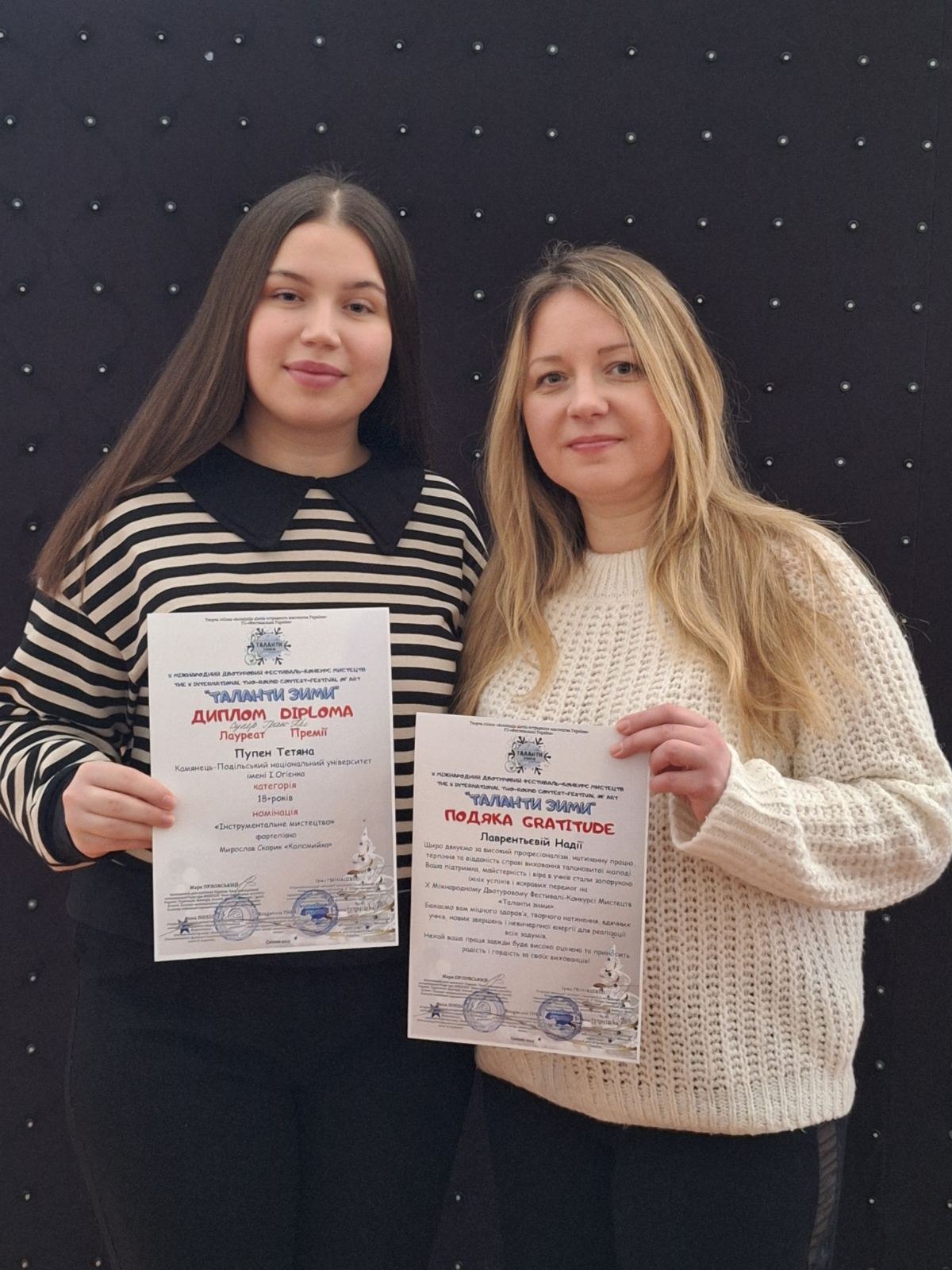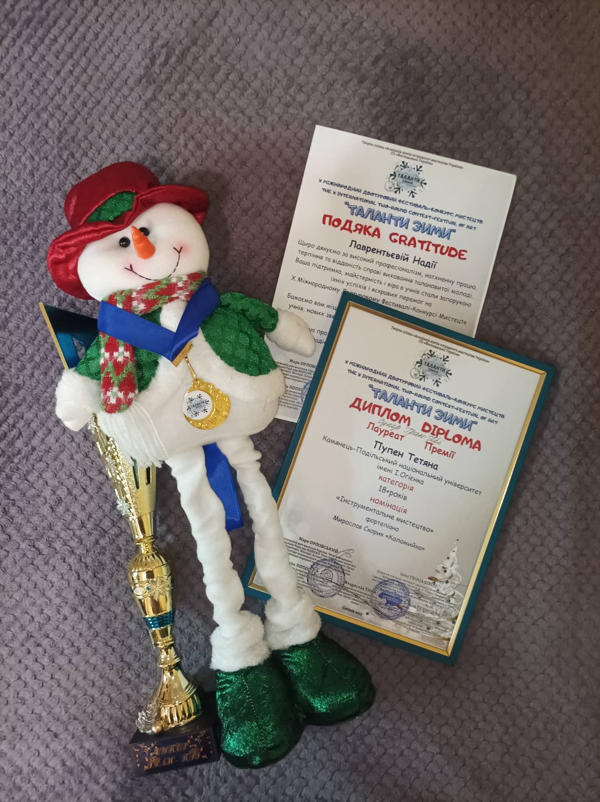 Щиро вітаємо Пупен Тетяну, здобувачку другого (магістерського) рівня вищої освіти предметної спеціальності Середня освіта (Мистецтво. Музичне мистецтво), з вагомим здобутком – Супер Гран Прі на Міжнародному двотуровому фестивалі-конкурсі мистецтв «Таланти зими» в номінації Інструментальне мистецтво, клас доцента Надії Лаврентьєвої.